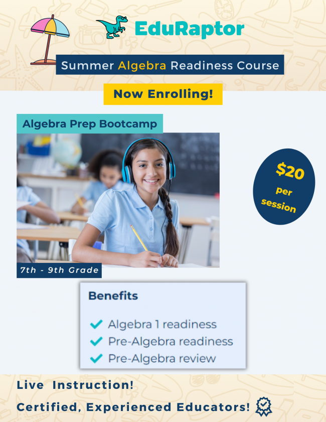 Students will have the opportunity to work in a small group setting with an experienced, certified Algebra teacher. Important learning targets from Pre-Algebra will be reviewed in this course. Live instruction by the instructor. Problems will be first modeled by the instructor, followed by guided problem-solving, and independent problem-solving opportunities. Relevant worksheets and homework will be sent to the students via the EduRaptor messaging system. It is highly recommended to print the materials out for the student before each session. The sessions will be collaborative and flexible to student learning.