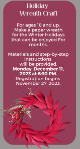 For ages 16 and up. Make a paper wreath for the Winter Holidays that can be enjoyed For months. For ages 16 and up. Materials and step-by-step instructions will be provided. Monday, December 11, 2023 at 6:30 PM. Registration begins November 27, 2023. https://buffalolib.libcal.com/event/11513125
