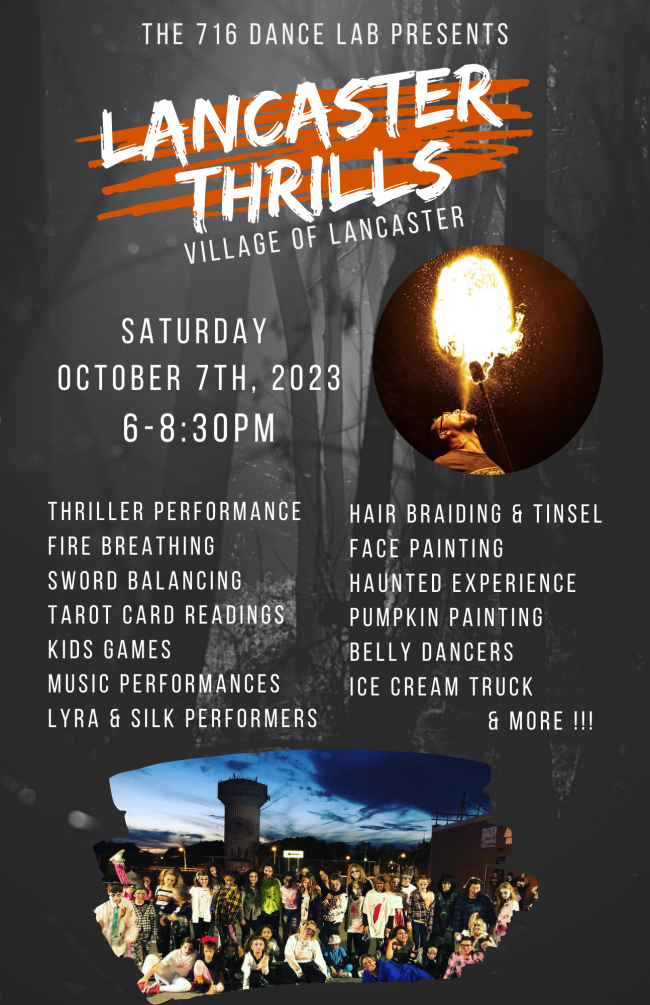 Village of Lancaster will be transformed into a Thriller street. With Performers dancing, juggling swords, eating fire, practicing Magic & more! Bring the kiddos and grab ice cream, get hair braided/tinsel, face painting & enjoy the spooktacular community Event on W. Main Street!