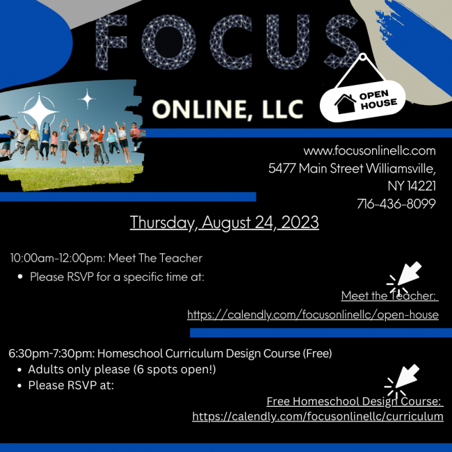 At the request of parents interested in the upcoming classes at Focus Online LLC (5477 Main Street Williamsville), I have put together an "Open House"-like day. Please feel free to RSVP below and message me with any questions or contact 716-436-8099